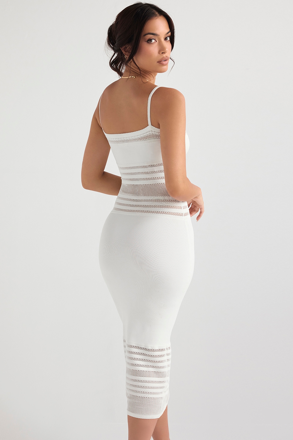 Cut from our new luxury custom made smooth knit that's blended with generous stretch in a soft ivory hue, our 'Gia' midi dress has an ultra feminine silhouette. It features a low straight neckline with a rouleau tie to the front and delicate shoulder straps. The pretty openwork detail throughout the dress reveals a hint of skin for a dash of daring and it has a zip to the left side for easy on. Wear yours with our