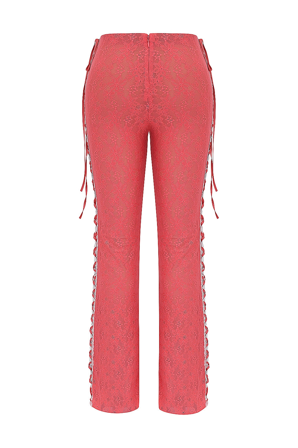 Our grapefruit trousers are crafted from stretch jersey lace and have a gorgeous lace trim and satin lace up ties through the sides for a touch of elegance. They're designed to sit mid-rise at the waist and have flattering straight legs with a zip to the back for easy on.