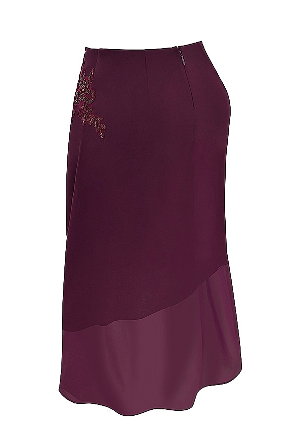 Our black cherry midi skirt has a gorgeous silhouette that stands out from the crowd. It sits mid-rise at the waist and is defined by the cutouts to the front, held by delicate buttons while falling to a floaty midi hem.