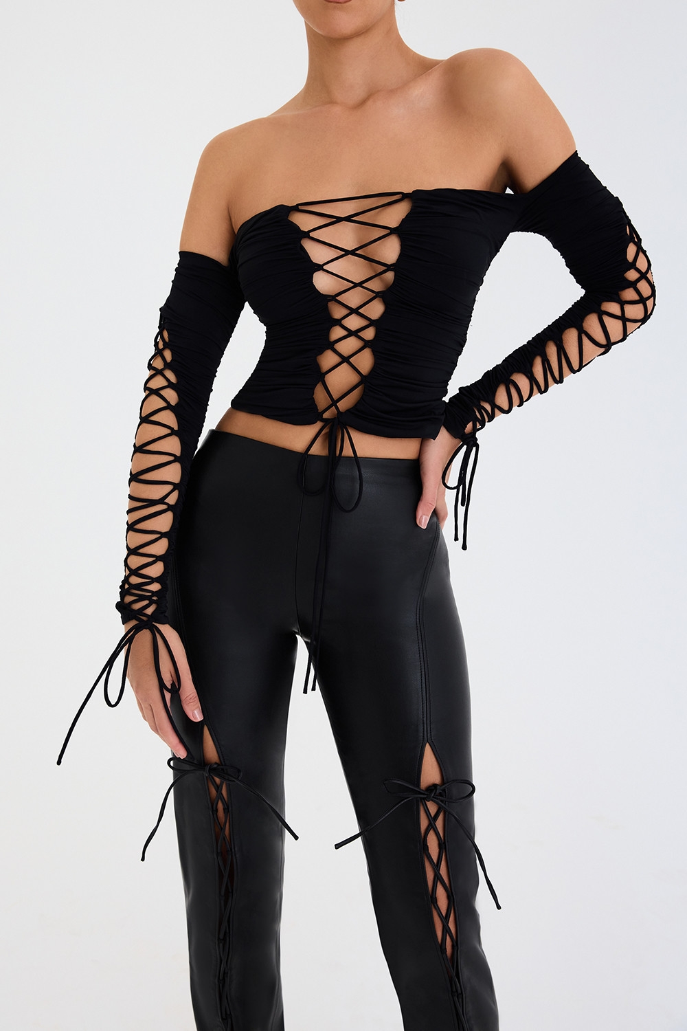 This sexy creation is the perfect top for nights out. It's cut from stretch black jersey that's gently gathered throughout to highlight your frame in an off the shoulder silhouette. We love the open work detailing to the sleeves and bodice with a lace up feature that showcases a flattering cleavage and satin ties for the perfect fit.