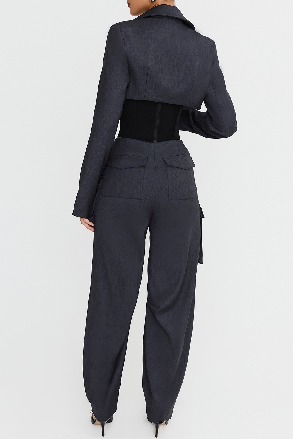 A hybrid of tailored and classic cargo styles, these dark grey trousers are the perfect 'wear anywhere' trousers for all seasons. Cut from stretch tailoring, they have oversized pockets for a cool utilitarian feel and relaxed wide legs.
