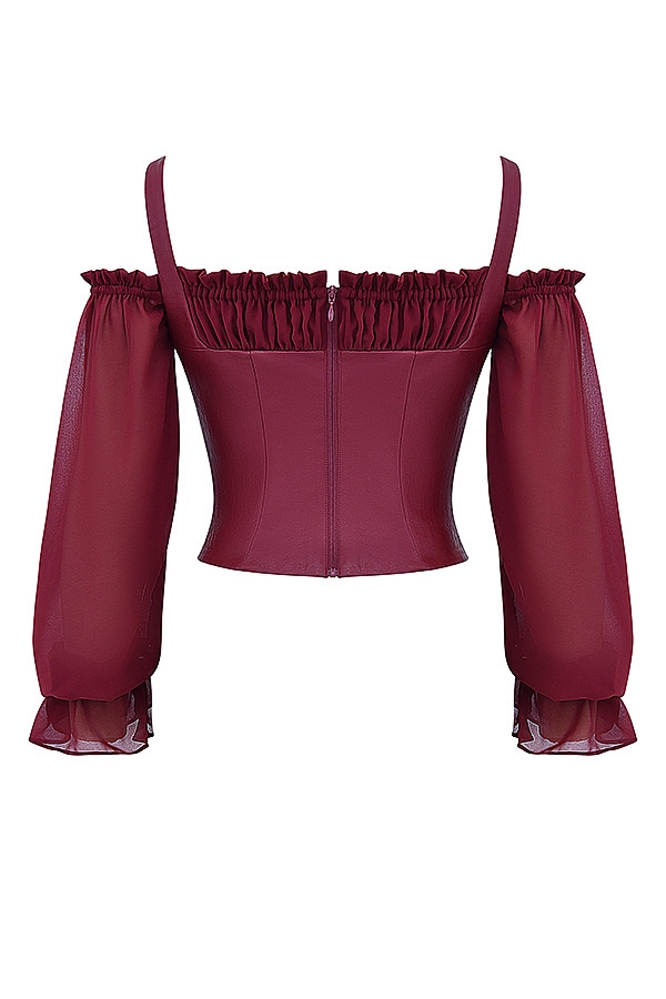 This pretty top is ultra feminine with a vintage feel and the kind that'll pair so well with denim. The bodice is cut from soft vegan leather that's boned throughout and has a beautifully gathered bust in an off the shoulder neckline with billowing long sleeves.