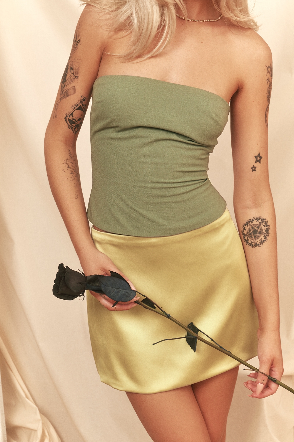 The simplest designs mean they work so well for most occasions and this micro mini skirt is ultra versatile. Cut from stretch fluid satin in a beautiful pear hue, it has a mid-rise waist and skims over the hips for a flattering close fit.