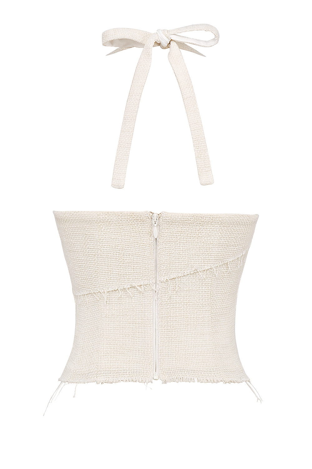 Made from taupe tweed, this effortlessly chic top has a fitted bodice supported by oversized halter straps. We love the asymmetric overlay and the frayed edges gives it a distressed feel while the open back creates a sexy vibe. Pair yours with